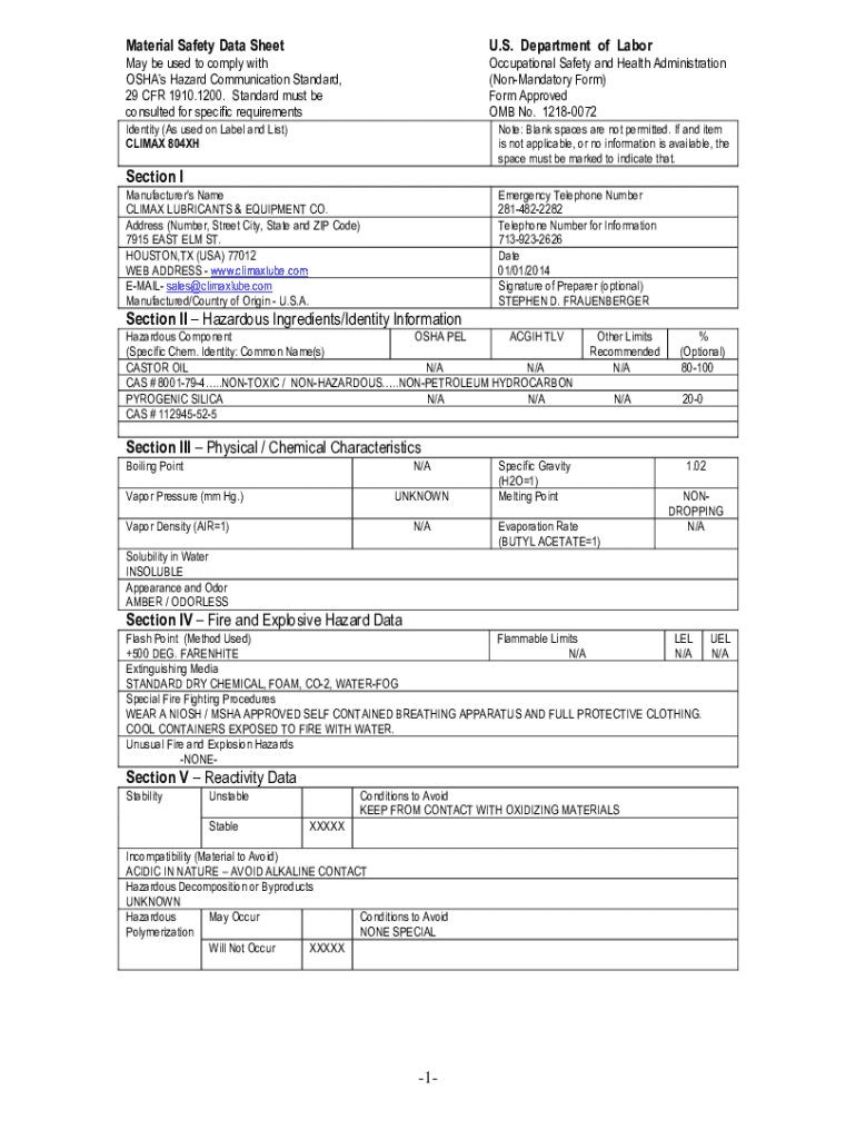 Material Safety Data Sheet. S. Department of Labor May be used to comply with