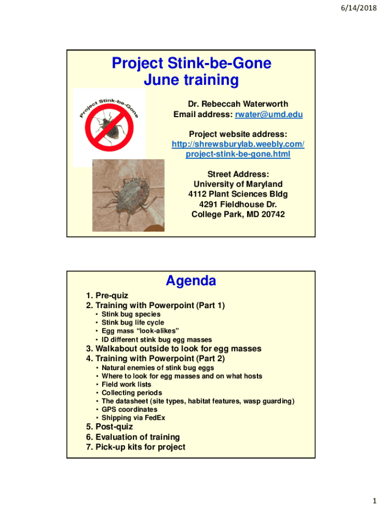 6/14/2018Project StinkbeGone June training Dr. Rebeccah Waterworth Email address: rwater@umd.edu Project website address: http://shrewsburylab.weebly.com/ projectstinkbegone.html Street Address: University