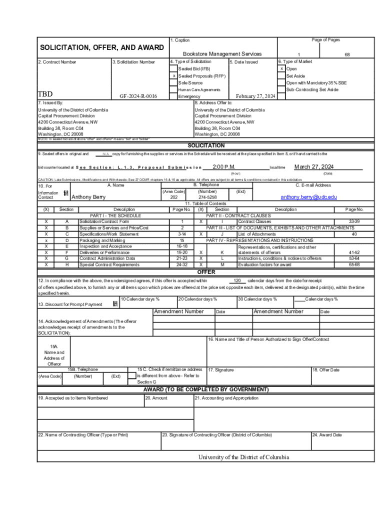 SOLICITATION, OFFER, AND AWARD 2. Contract NumberPage of Pages1. CaptionBookstore Management Services 4. Type of Solicitation3. Solicitation Number1 x OpenSealed Bid (IFB) x Sealed Proposals (RFP)TBDGF2024R0016Set