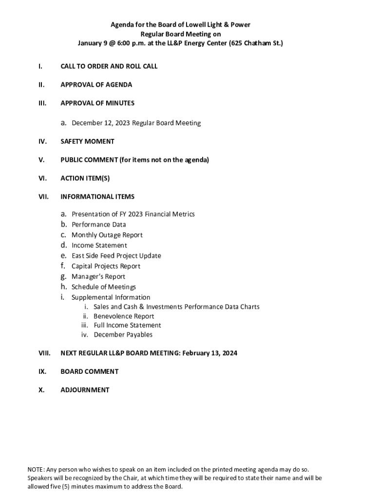 Agenda for the Board of Lowell Light & Power Regular Board Meeting on January 9 @ 6:00 p.m. at the LL&P Energy Center (625 Chatham St.) I.CALL TO ORDER AND ROLL CALLII.APPROVAL OF AGENDAIII.APPROVAL