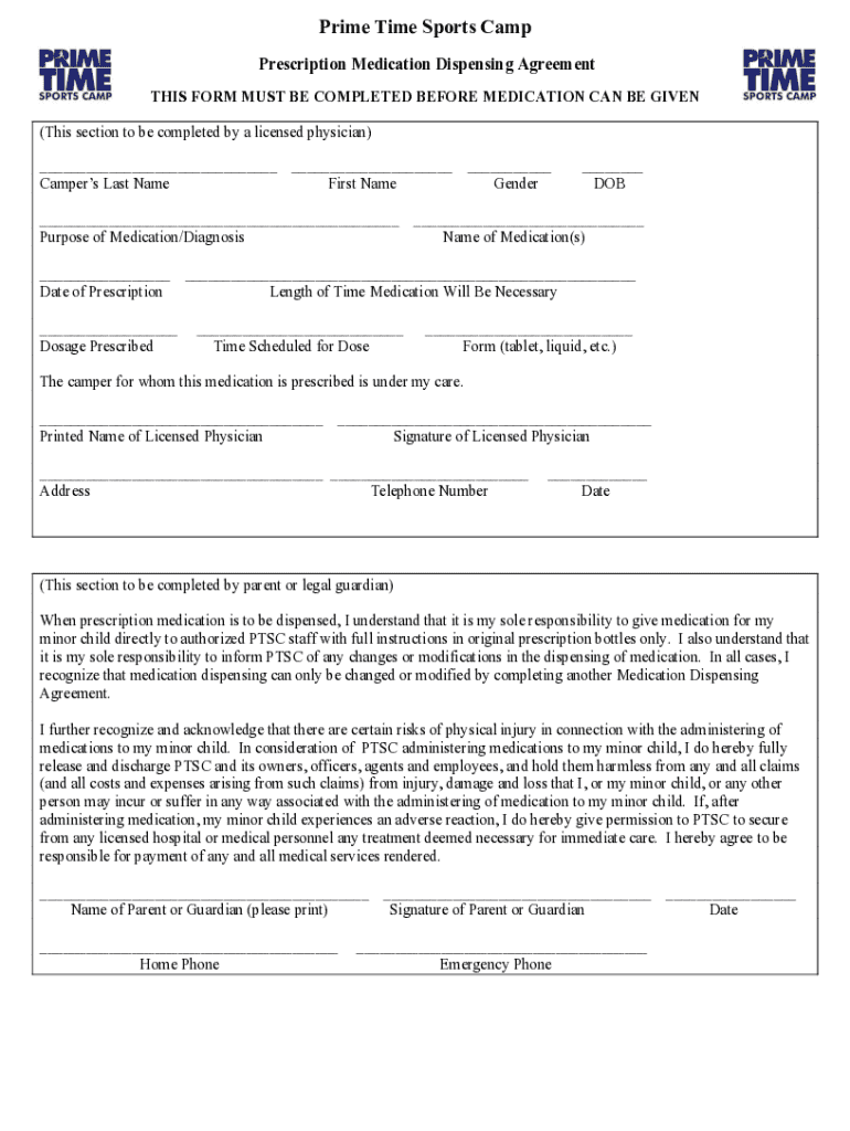 Prime Time Sports Camp Prescription Medication Dispensing Agreement THIS FORM MUST BE COMPLETED BEFORE MEDICATION CAN BE GIVEN (This section to be completed by a licensed physician) ___ ___ ___ Campers
