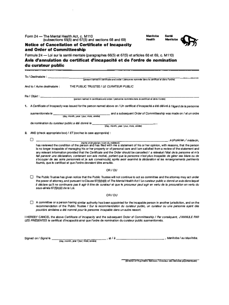 Form 24 The Mental Health Act, c. M110 (subsections 65(5) and 67(5) and sections 68 and 69) Notice of Cancellation of Certificate of Incapacity and Order of CommitteeshipManitoba HealthSante ManitobaFormule