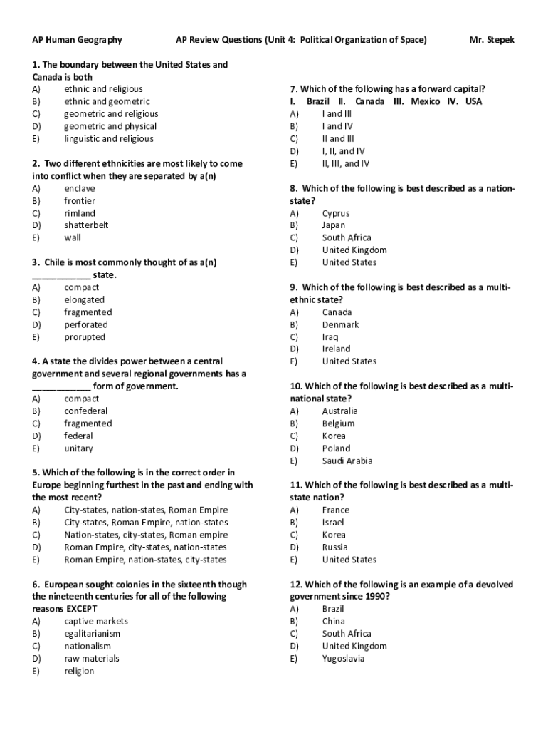 AP Human GeographyAP Review Questions (Unit 4: Political Organization of Space)1. The boundary between the United States and