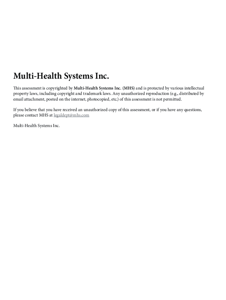 MultiHealth Systems Inc. This assessment is copyrighted by MultiHealth Systems Inc. (MHS) and is protected by various intellectual property laws, including copyright and trademark laws. Any unauthorized