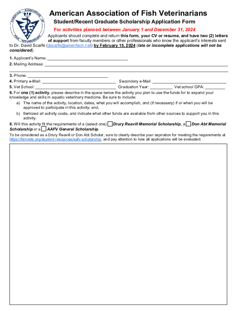 American Association of Fish Veterinarians Student/Recent Graduate Scholarship Application Form For activities planned between January 1 and December 31, 2024 Applicants should complete and return