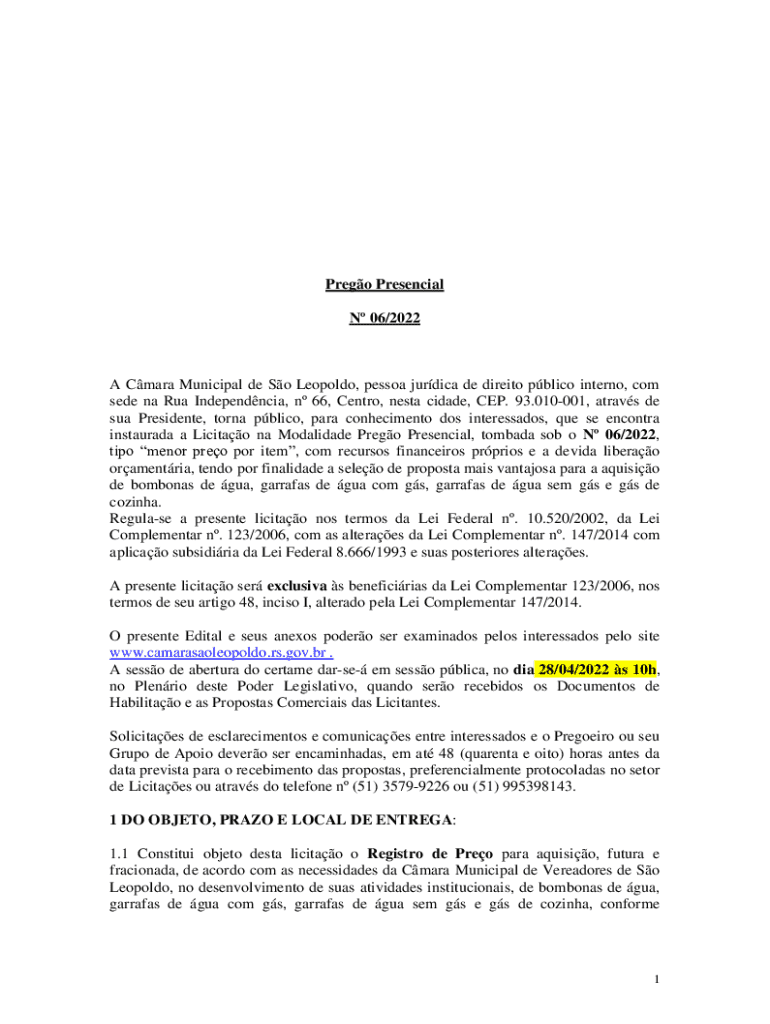 Prego Presencial N 06/2022A Cmara Municipal de So Leopoldo, pessoa jurdica de direito pblico interno, com sede na Rua Independncia, n 66, Centro, nesta cidade, CEP. 93.010001, atravs de sua Presidente,
