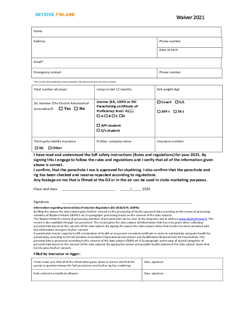Waiver 2021 Name AddressPhone number Date of birthEmail* Emergency contactPhone number*We do not send marketing email, important club announcements are sent via emailTotal number of jumps:SIL member