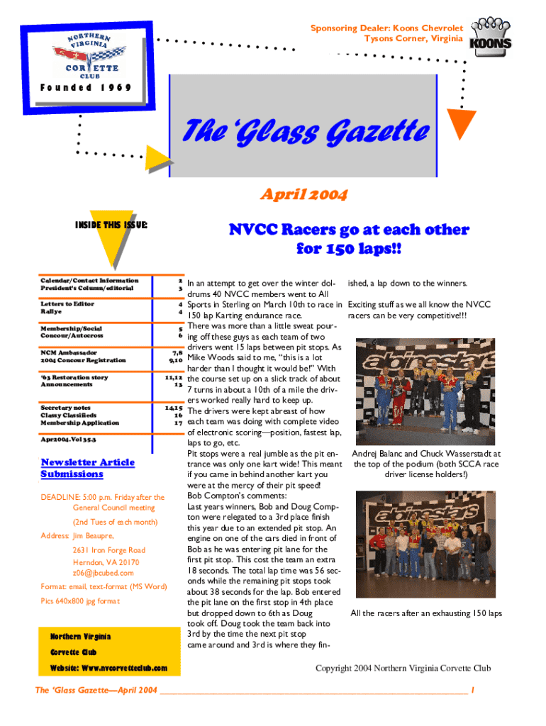 Sponsoring Dealer: Koons Chevrolet Tysons Corner, VirginiaFounded1969The Glass Gazette April 2004 INSIDE THIS ISSUE:NVCC Racers go at each other for 150 laps!!Calendar/Contact Information Presidents