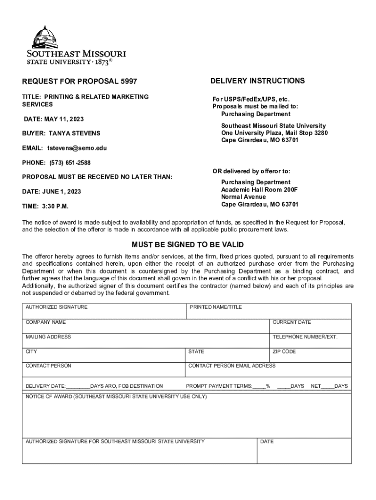 DELIVERY INSTRUCTIONSREQUEST FOR PROPOSAL 5997 TITLE: PRINTING & RELATED MARKETING SERVICESFor USPS/FedEx/UPS, etc. Proposals must be mailed to: Purchasing DepartmentDATE: MAY 11, 2023Southeast Missouri