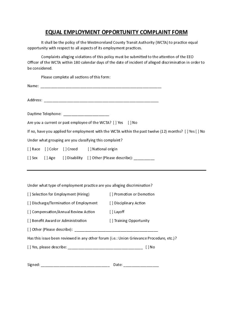 EQUAL EMPLOYMENT OPPORTUNITY COMPLAINT FORM It shall be the policy of the Westmoreland County Transit Authority (WCTA) to practice equal opportunity with respect to all aspects of its employment practices.