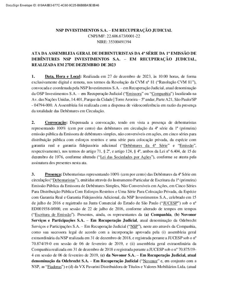 DocuSign Envelope ID: 619AA8B3677C4C609C25B6B8BA5E0B46NSP INVESTIMENTOS S.A. EM RECUPERAO JUDICIAL CNPJ/MF: 22.606.673/000122 NIRE: 35300491394 ATA DA ASSEMBLEIA GERAL DE DEBENTURISTAS DA 4 SRIE DA