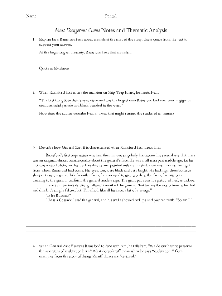 Name:Period:Most Dangerous Game Notes and Thematic Analysis 1. Explain how Rainsford feels about animals at the start of the story. Use a quote from the text to support your answer. At the beginning