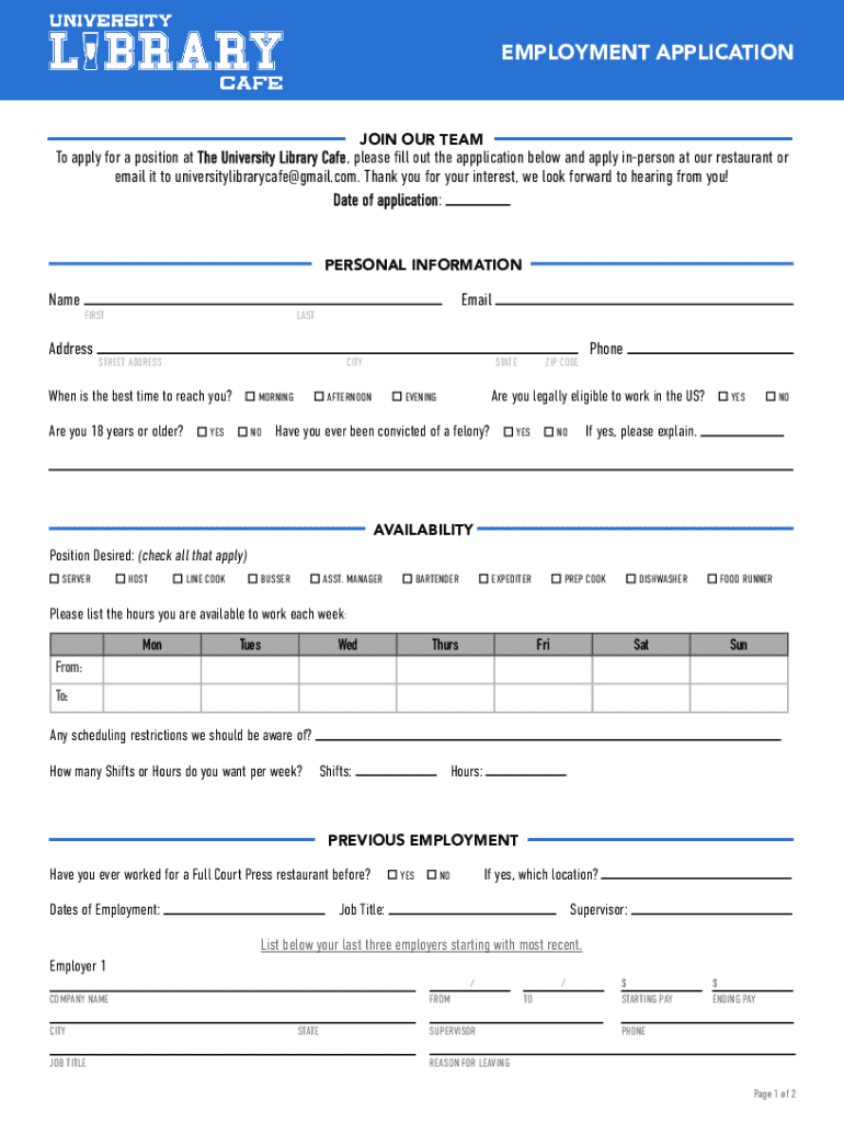 EMPLOYMENT APPLICATIONJOIN OUR TEAMTo apply for a position at The University Library Cafe, Cafe please fill out the appplication below and apply inperson at our restaurant or email it to universitylibrarycafe@gmail.com.