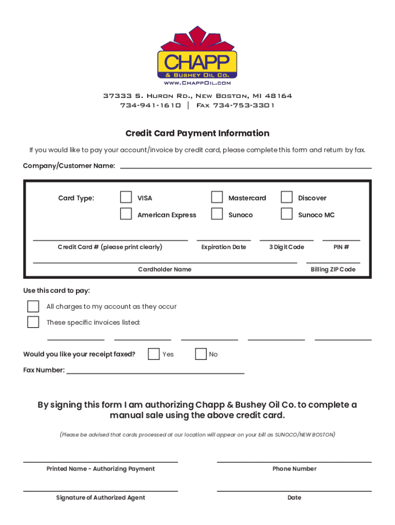 37333 S. Huron Rd., New Boston, MI 48164 7349411610 | Fax 7347533301Credit Card Payment Information If you would like to pay your account/invoice by credit card, please complete this form and return