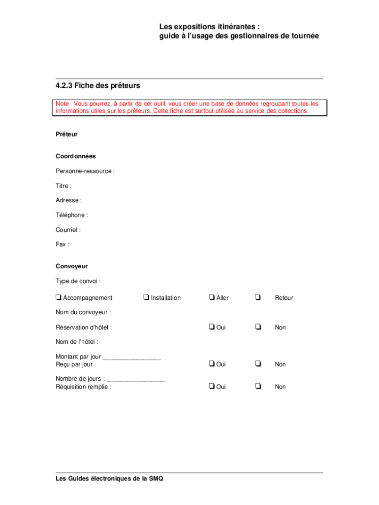 Les expositions itinrantes : guide lusage des gestionnaires de tourne4.2.3 Fiche des prteurs Note : Vous pourrez, partir de cet outil, vous crer une base de donnes regroupant toutes les informations