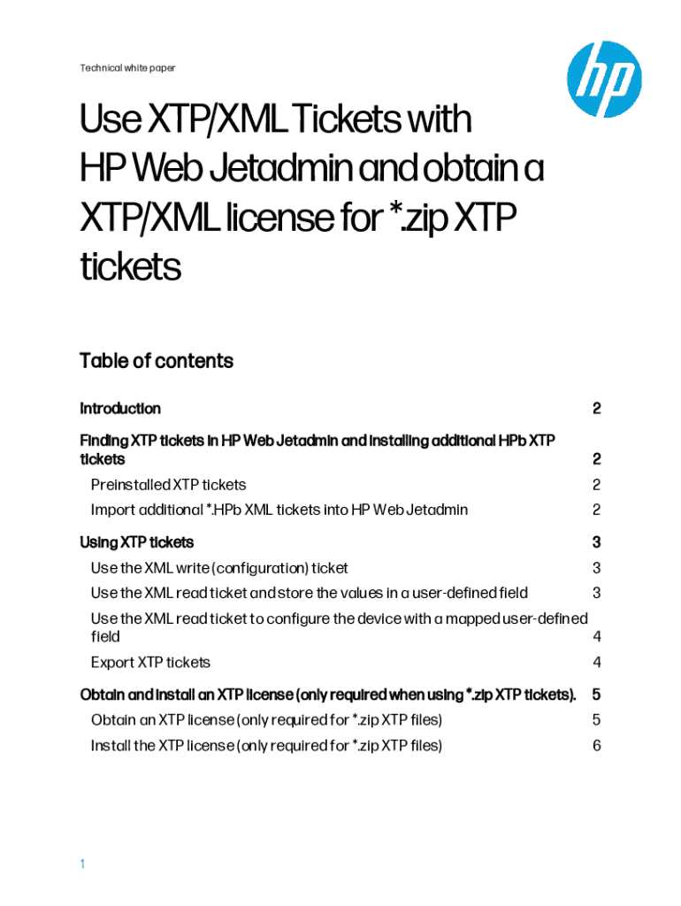 Technical white paperUse XTP/XML Tickets with HP Web Jetadmin and obtain a XTP/XML license for *.zip XTP tickets Table of contents Introduction2Finding XTP tickets in HP Web Jetadmin and installing