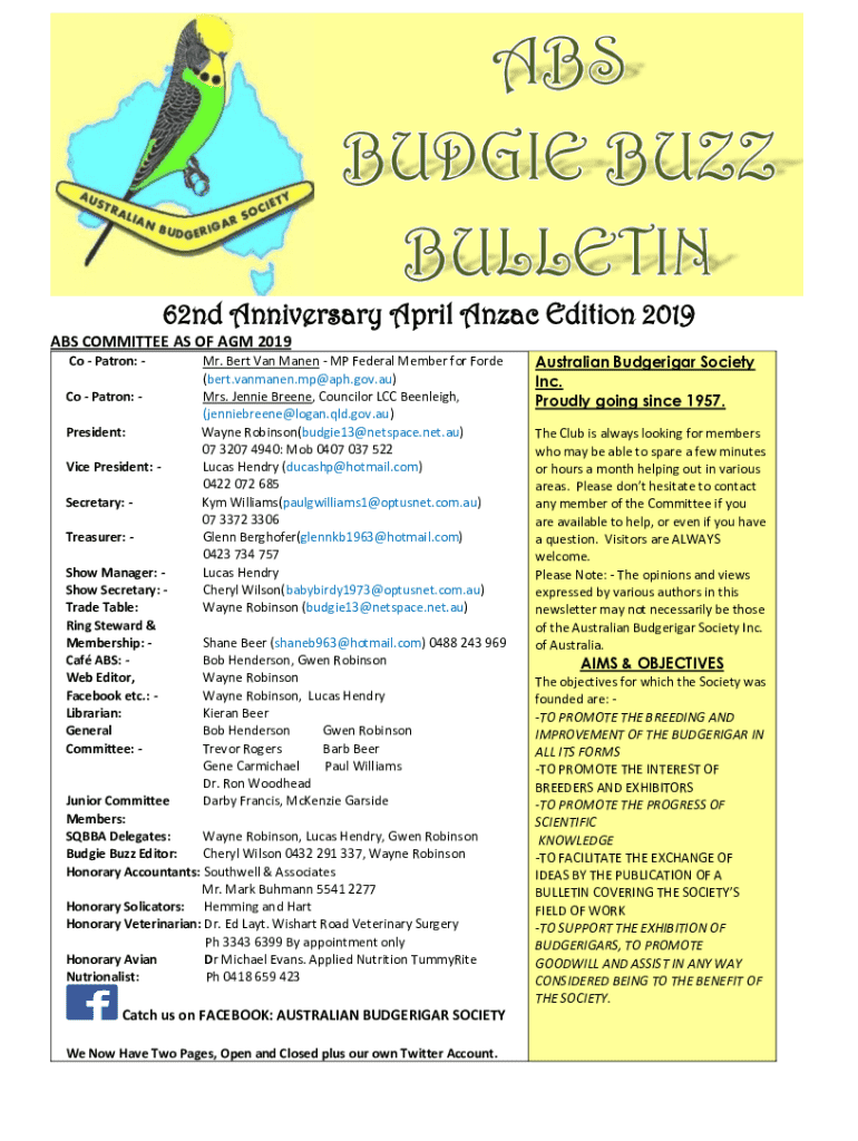 62nd Anniversary April Anzac Edition 2019 ABS COMMITTEE AS OF AGM 2019 Co Patron: Co Patron: President: Vice President: Secretary: Treasurer: Show Manager: Show Secretary: Trade Table: Ring Steward
