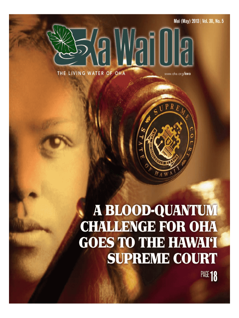 Mei (May) 2013 | Vol. 30, No. 5t h e l i v i n g w at e r o f o h awww.oha.org/kwoA bloodquantum challenge for OHA goes to the Hawaii Supreme Court page18Follow us:/oha_hawaii | Fan us:/officeofhawaiianaffairs