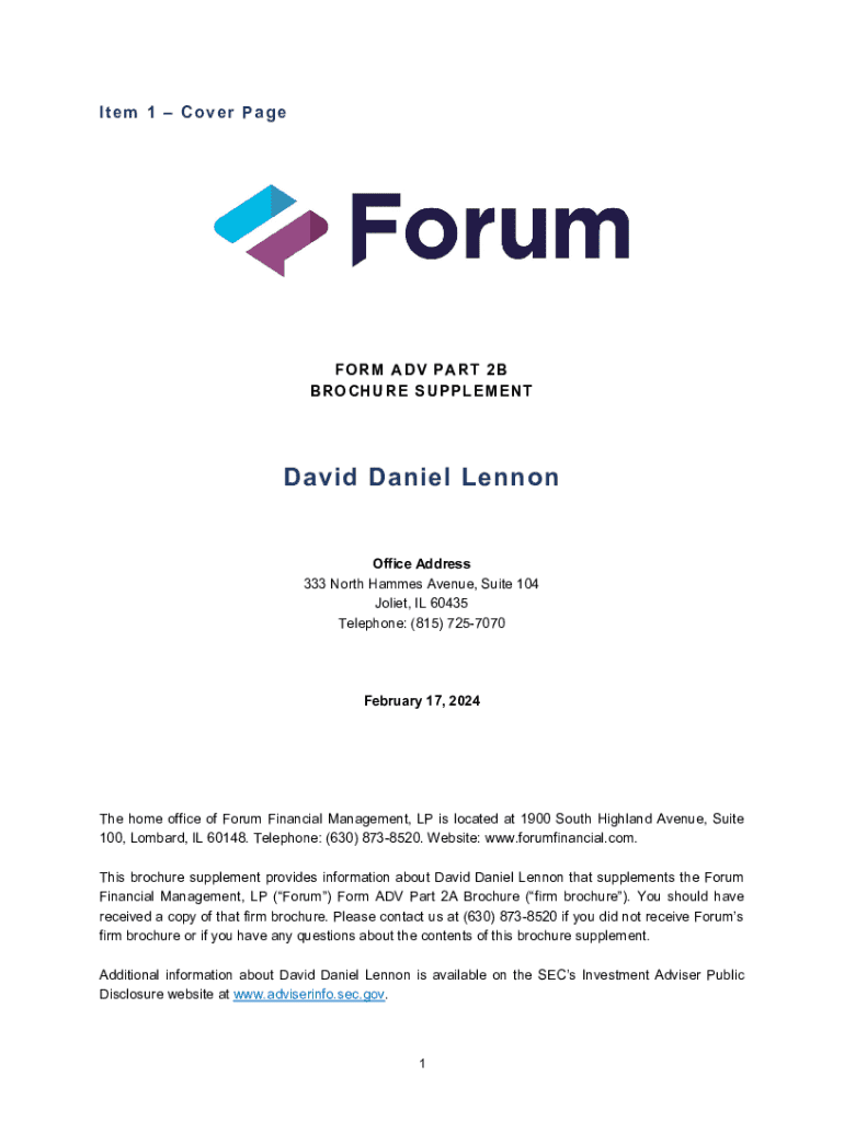 I te m 1 Co v e r P ageFO RM A DV PA RT 2B BRO CHU RE SU PPL EM ENTDavid Daniel LennonOffice Address 333 North Hammes Avenue, Suite 104 Joliet, IL 60435 Telephone: (815) 7257070February 17, 2024The