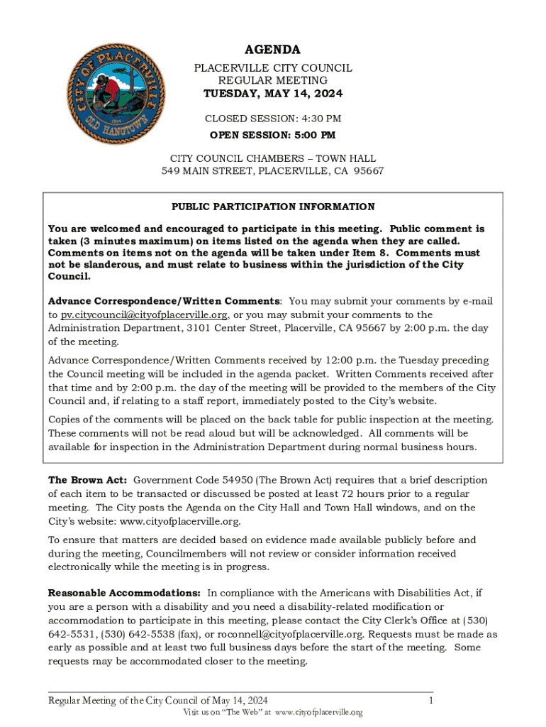 AGENDA PLACERVILLE CITY COUNCIL REGULAR MEETING TUESDAY, MAY 14, 2024 CLOSED SESSION: 4:30 PM OPEN SESSION: 5:00 PM CITY COUNCIL CHAMBERS TOWN HALL 549 MAIN STREET, PLACERVILLE, CA 95667 PUBLIC PARTICIPATION
