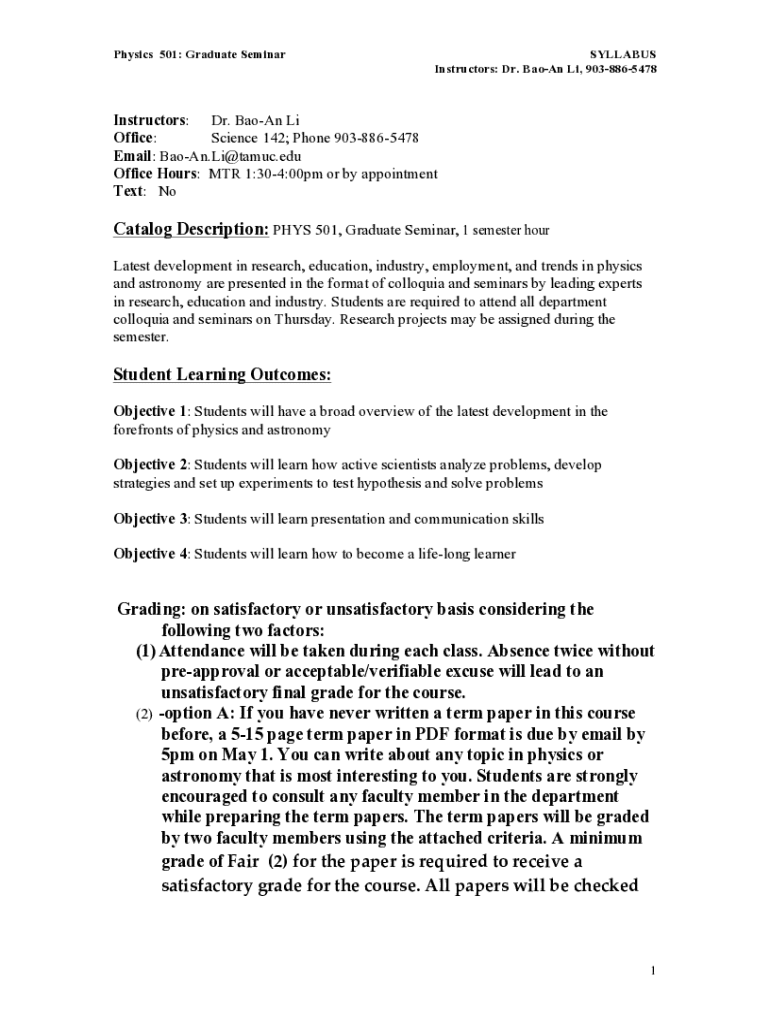 Physics 501: Graduate SeminarSYLLABUS Instructors: Dr. BaoAn Li, 9038865478Instructors: Dr. BaoAn Li Office: Science 142; Phone 9038865478 Email: BaoAn.Li@tamuc.edu Office Hours: MTR 1:304:00pm or