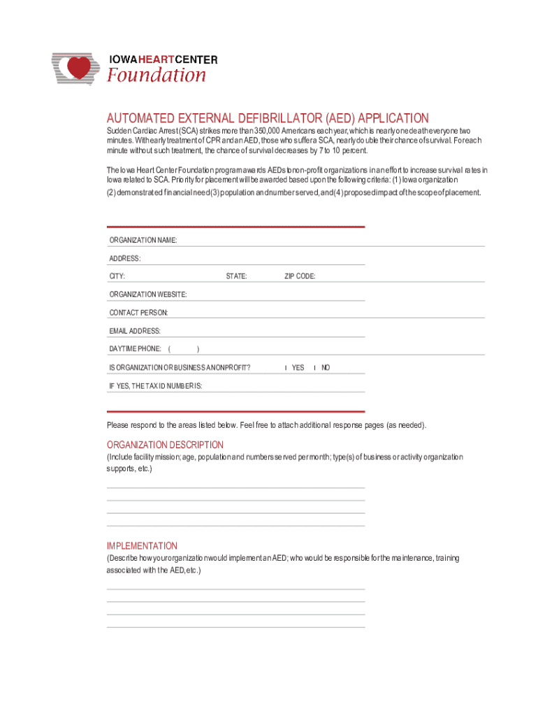 To fill out the form, include details such as the location of the defibrillator, the number of trained personnel, and emergency contact information.