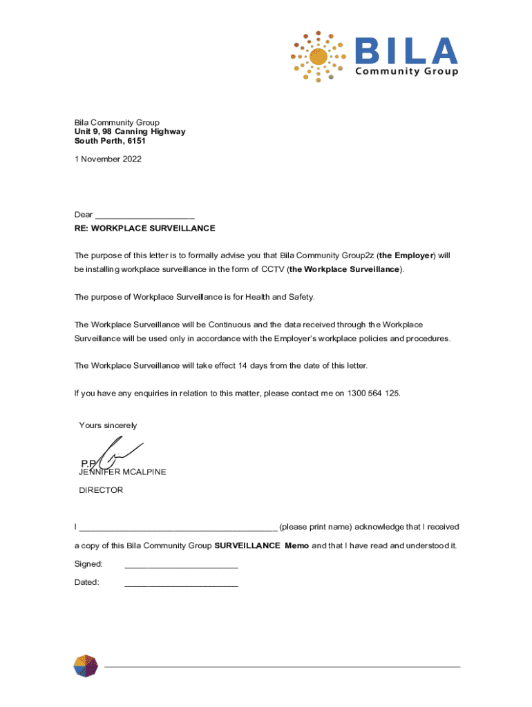 Bila Community Group Unit 9, 98 Canning Highway South Perth, 6151 1 November 2022Dear ___ RE: WORKPLACE SURVEILLANCE The purpose of this letter is to formally advise you that Bila Community Group2z