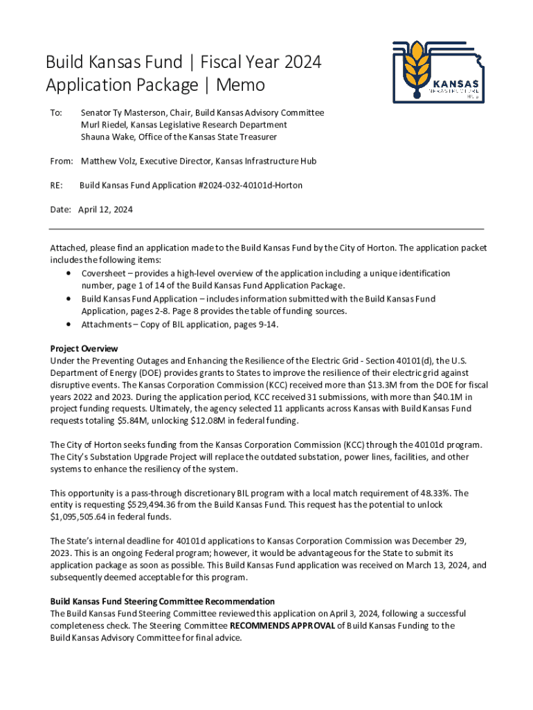Build Kansas Fund | Fiscal Year 2024 Application Package | Memo To:Senator Ty Masterson, Chair, Build Kansas Advisory Committee Murl Riedel, Kansas Legislative Research Department Shauna Wake, Office