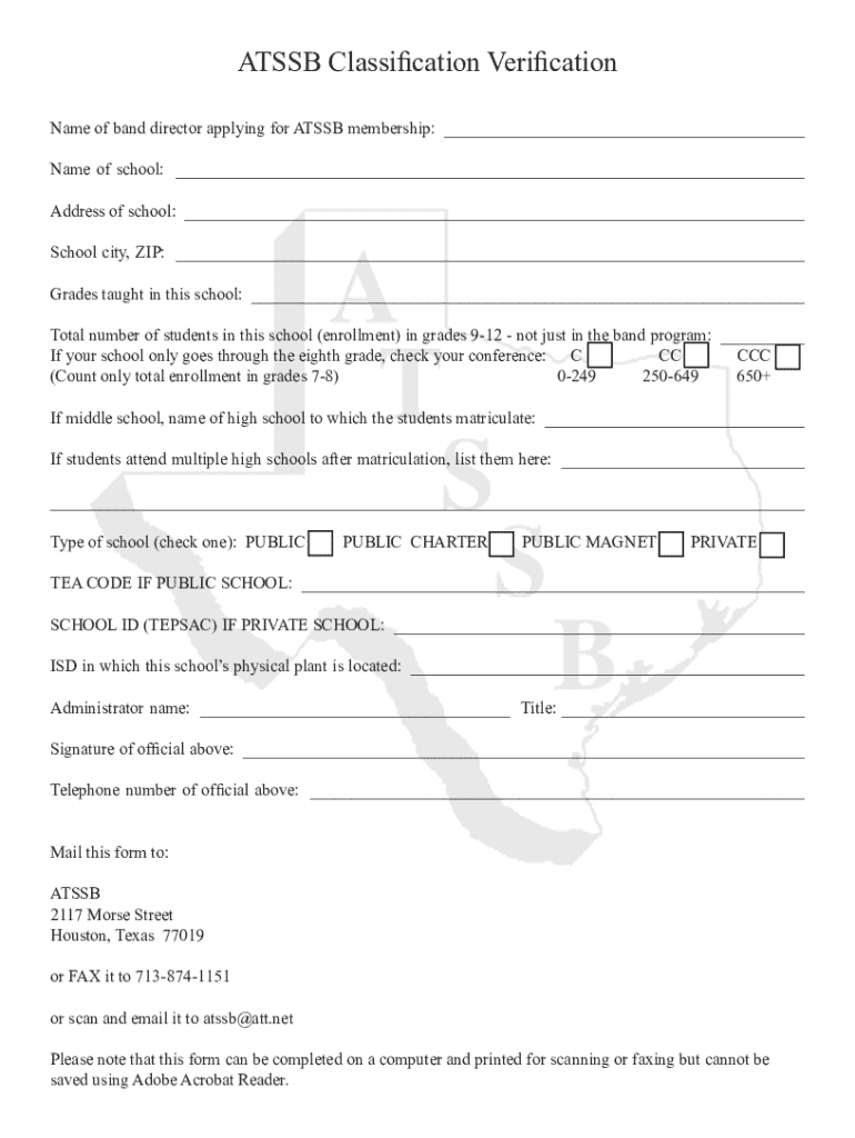 ATSSB Classification Verification Name of band director applying for ATSSB membership: ___ Name of school: ___ Address of school: ___ School city, ZIP: ___ Grades taught in this school: ___ Total