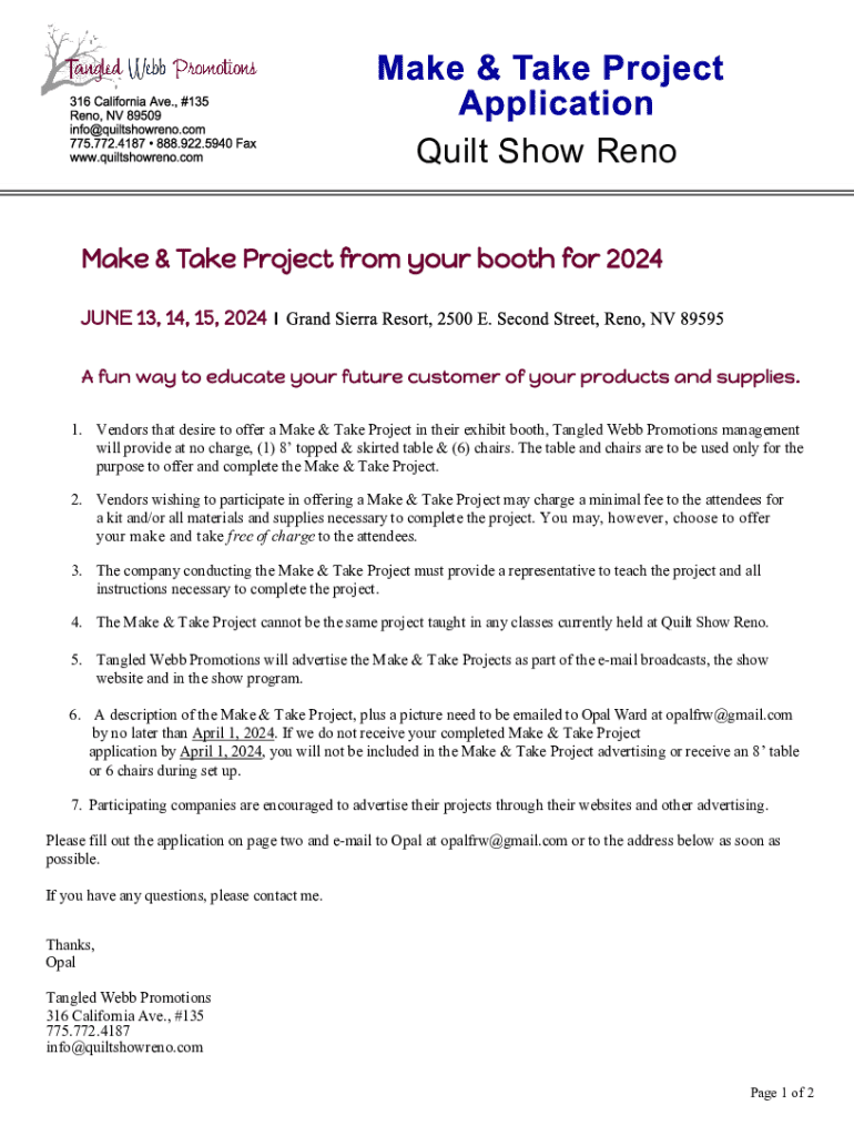 Quilt Show Reno Make & Take Project from your booth for 2024 JUNE 13, 14, 15, 20241. Vendors that desire to offer a Make & Take Project in their exhibit booth, Tangled Webb Promotions management will