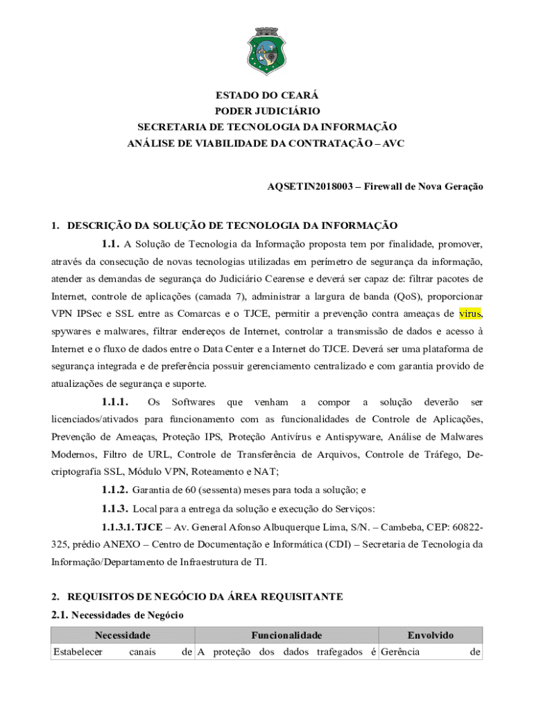 ESTADO DO CEAR PODER JUDICIRIO SECRETARIA DE TECNOLOGIA DA INFORMAO ANLISE DE VIABILIDADE DA CONTRATAO AVCAQSETIN2018003 Firewall de Nova Gerao1. DESCRIO DA SOLUO DE TECNOLOGIA DA INFORMAO1.1. A Soluo
