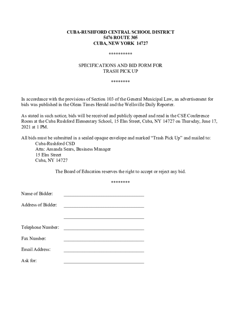 CUBARUSHFORD CENTRAL SCHOOL DISTRICT 5476 ROUTE 305 CUBA, NEW YORK 14727 ********** SPECIFICATIONS AND BID FORM FOR TRASH PICK UP ******** In accordance with the provisions of Section 103 of the General