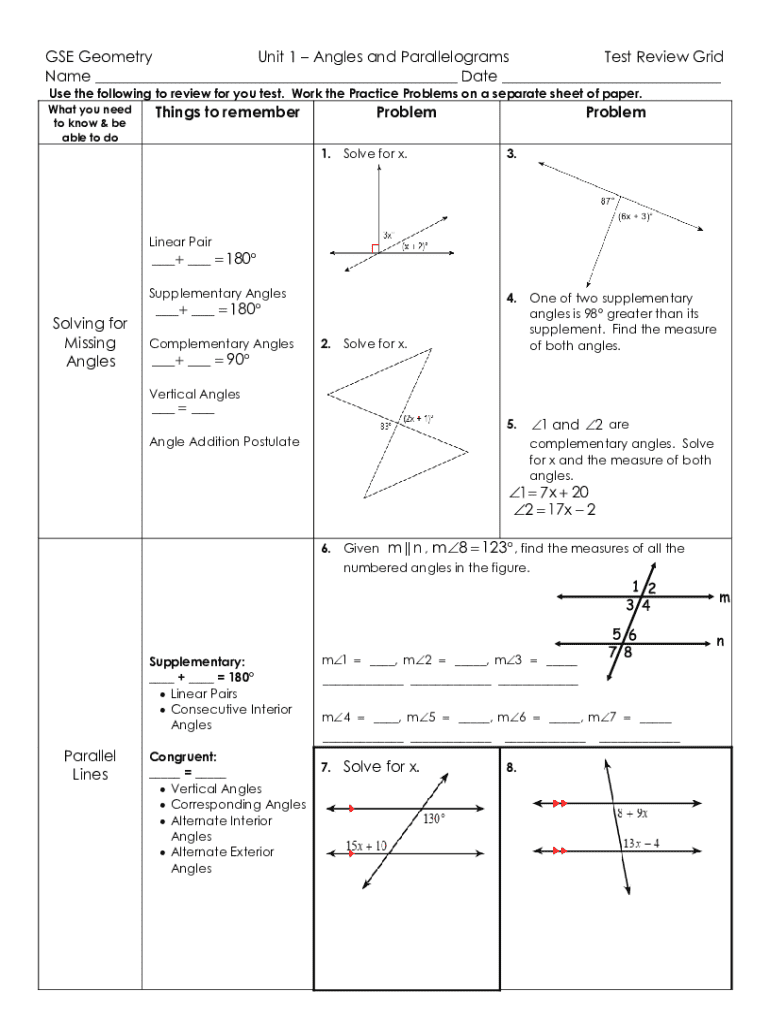 GSE Geometry Unit 1 Angles and Parallelograms Test Review Grid Name ___ Date ___ Use the following to review for you test. Work the Practice Problems on a separate sheet of paper. What you need to