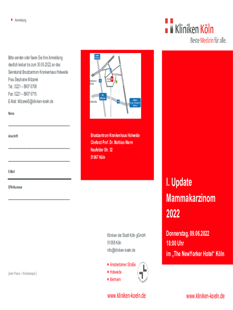 AnmeldungBitte senden oder faxen Sie Ihre Anmeldung deutlich lesbar bis zum 30.05.2022 an das: Sekretariat Brustzentrum Krankenhaus Holweide Frau Stephanie Milzarek Tel.: 0221 8907 6708 Fax: 0221