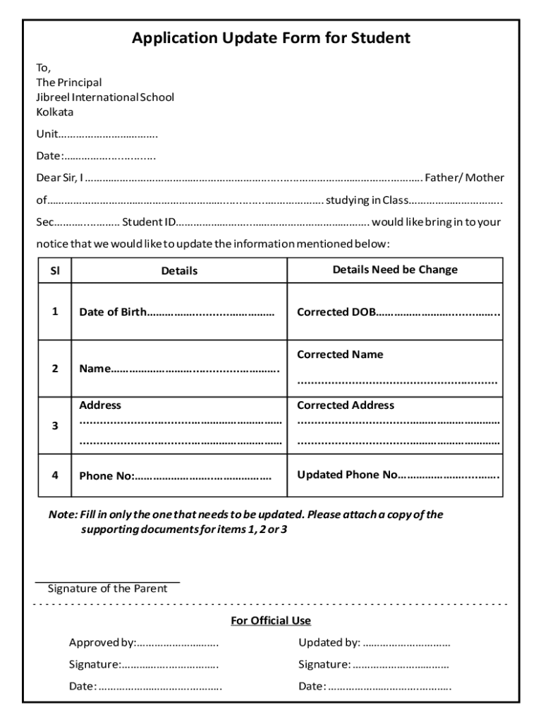 Application Update Form for Student To, The Principal Jibreel International School Kolkata Unit. Date:............... Dear Sir, I ............... Father/ Mother of............... studying in Class..