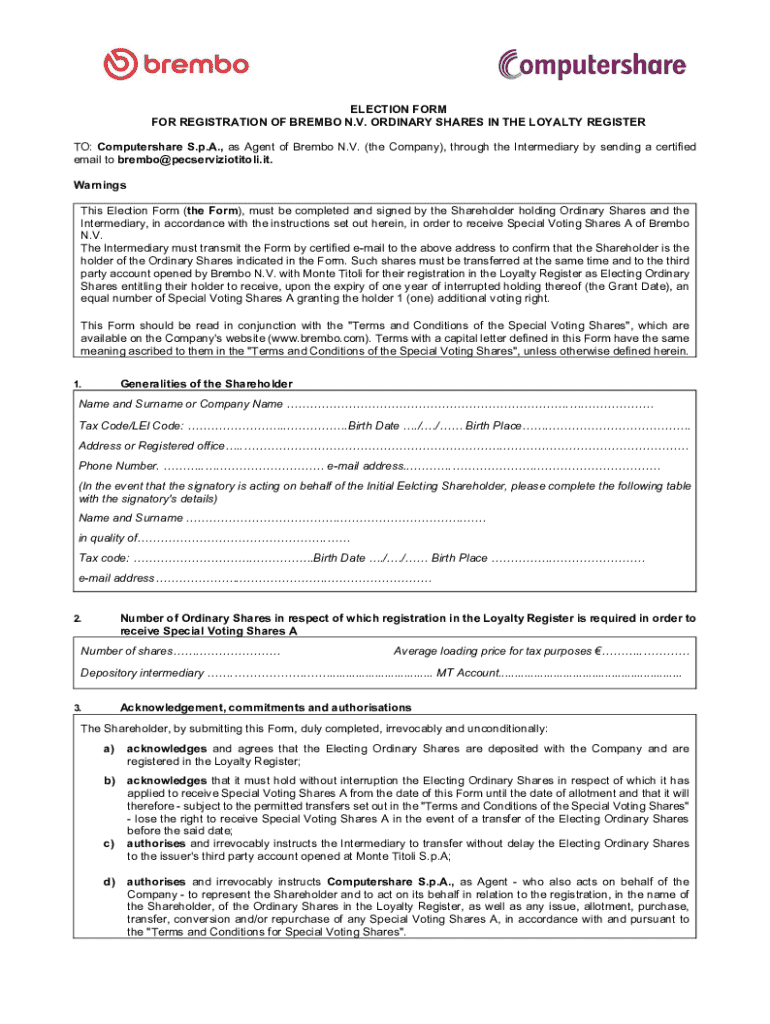 ELECTION FORM FOR REGISTRATION OF BREMBO N.V. ORDINARY SHARES IN THE LOYALTY REGISTER TO: Computershare S.p.A., as Agent of Brembo N.V. (the Company), through the Intermediary by sending a certified