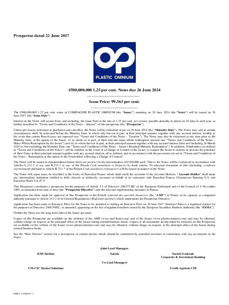 Prospectus dated 22 June 2017500,000,000 1.25 per cent. Notes due 26 June 2024 ___ Issue Price: 99.363 per cent. ___ The 500,000,000 1.25 per cent. notes of COMPAGNIE PLASTIC OMNIUM (the Issuer) maturing
