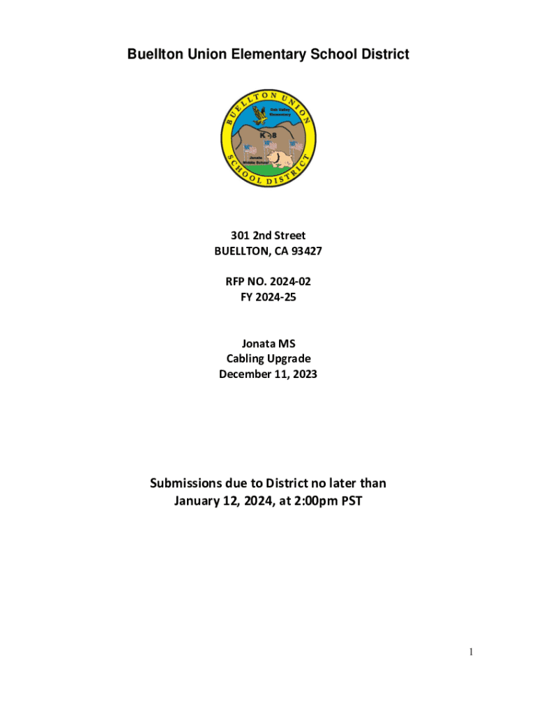 Buellton Union Elementary School District301 2nd Street BUELLTON, CA 93427 RFP NO. 202402 FY 202425Jonata MS Cabling Upgrade December 11, 2023Submissions due to District no later than January 12,