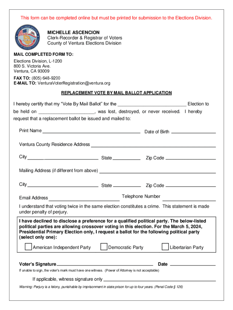 This form can be completed online but must be printed for submission to the Elections Division. MICHELLE ASCENCION ClerkRecorder & Registrar of Voters County of Ventura Elections Division MAIL COMPLETED