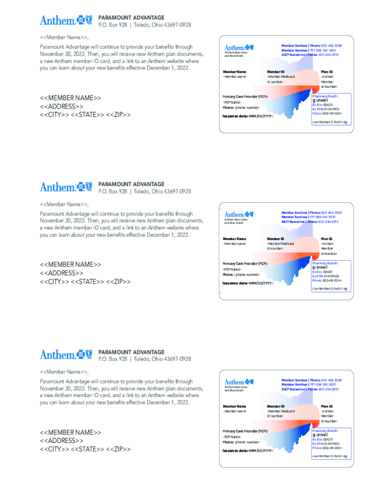 PARAMOUNT ADVANTAGE P.O. Box 928 | Toledo, Ohio 436970928 Member Name, Paramount Advantage will continue to provide your benefits through November 30, 2022. Then, you will receive new Anthem plan