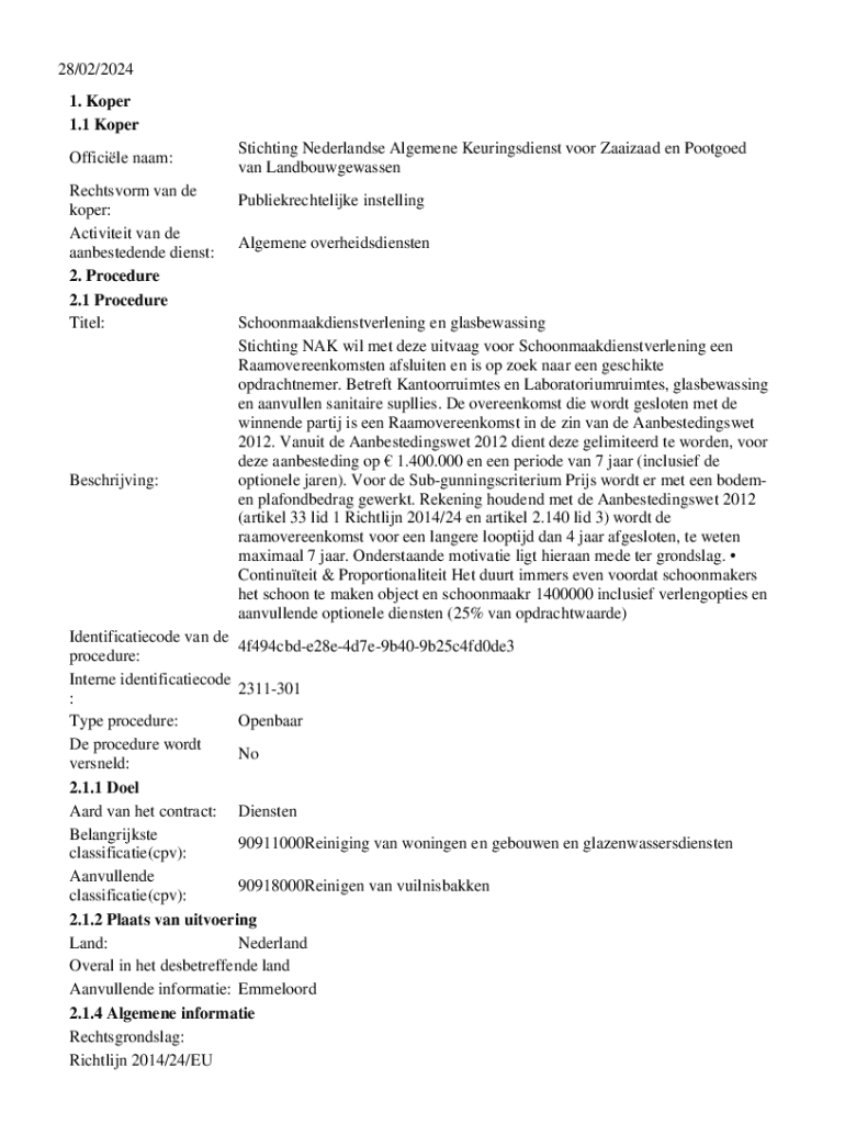 28/02/2024 1. Koper 1.1 Koper Officile naam: Rechtsvorm van de koper: Activiteit van de aanbestedende dienst: 2. Procedure 2.1 Procedure Titel:Beschrijving:Stichting Nederlandse Algemene Keuringsdienst