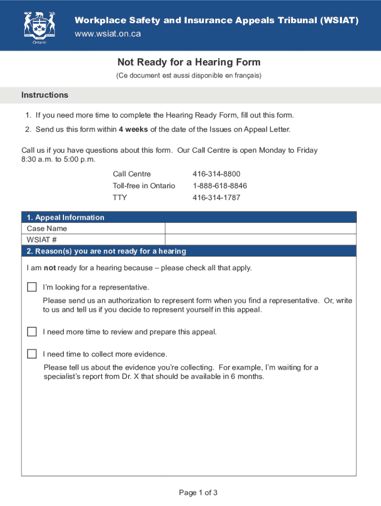 Workplace Safety and Insurance Appeals Tribunal (WSIAT) www.wsiat.on.caNot Ready for a Hearing Form (Ce document est aussi disponible en franais)Instructions 1. If you need more time to complete the