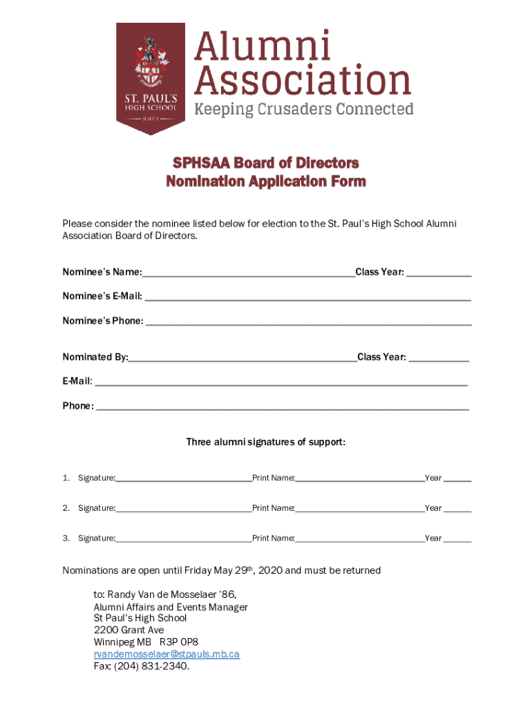 SPHSAA Board of Directors Nomination Application Form Please consider the nominee listed below for election to the St. Pauls High School Alumni Association Board of Directors. Nominees Name:Class
