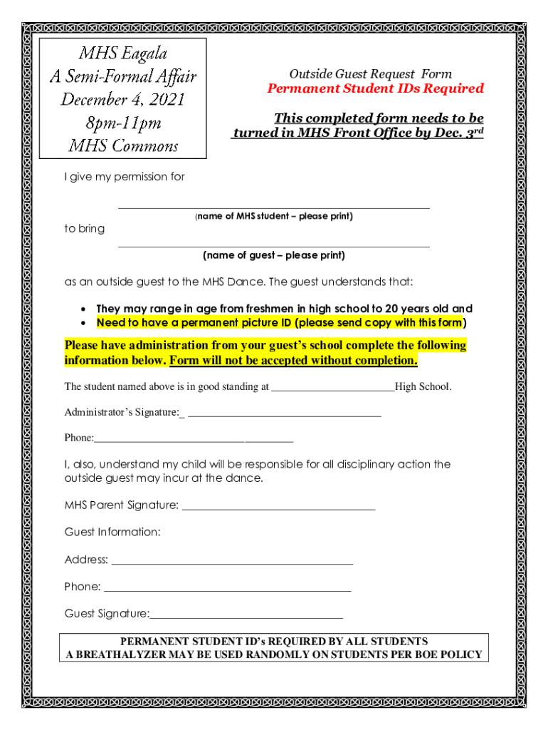 Outside Guest Request Form Permanent Student IDs Required This completed form needs to be turned in MHS Front Office by Dec. 3rd I give my permission for ___ (nameof MHS student please print)to bring