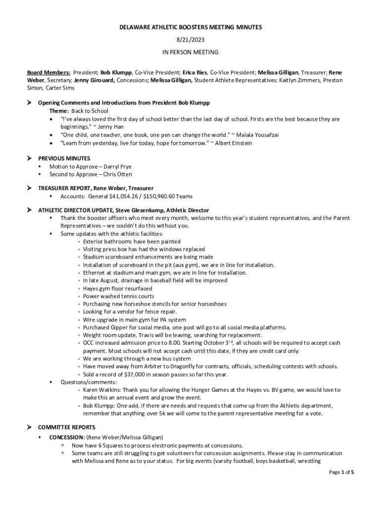 DELAWARE ATHLETIC BOOSTERS MEETING MINUTES 8/21/2023 IN PERSON MEETING Board Members: President; Bob Klumpp, CoVice President; Erica Ries, CoVice President; Melissa Gilligan, Treasurer; Rene Weber,