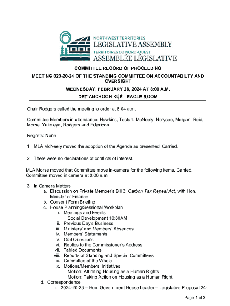 COMMITTEE RECORD OF PROCEEDING MEETING 0202024 OF THE STANDING COMMITTEE ON ACCOUNTABILTY AND OVERSIGHT WEDNESDAY, FEBRUARY 28, 2024 AT 8:00 A.M. DETANCHOGH KU EAGLE ROOM Chair Rodgers called the