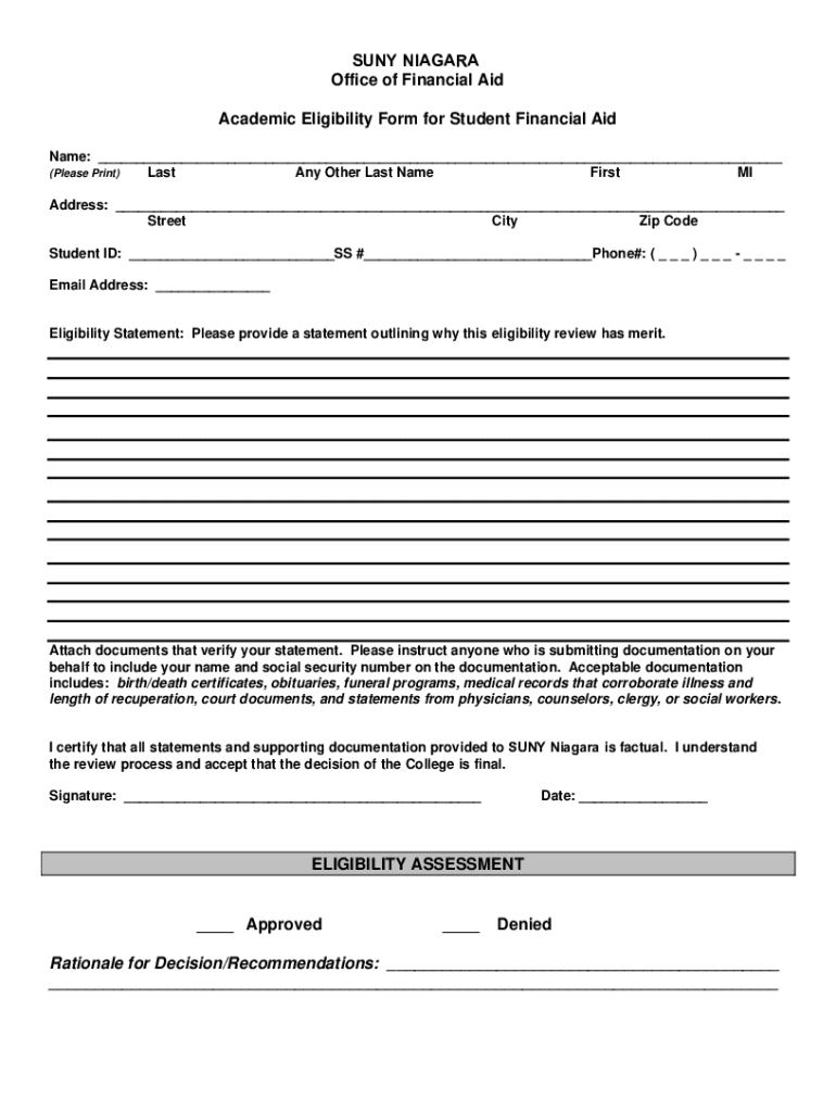 SUNY NIAGARA Office of Financial Aid Academic Eligibility Form for Student Financial Aid Name: ___ Last Any Other Last Name First MI(Please Print)Address: ___ Street City Zip Code Student ID: ___SS