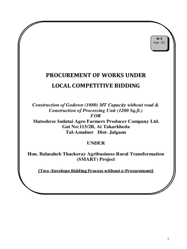 W2 Sep 23PROCUREMENT OF WORKS UNDER LOCAL COMPETITIVE BIDDING Construction of Godown (1080) MT Capacity without road & Construction of Processing Unit (1200 Sq.ft.) FOR Matoshree Indutai Agro Farmers