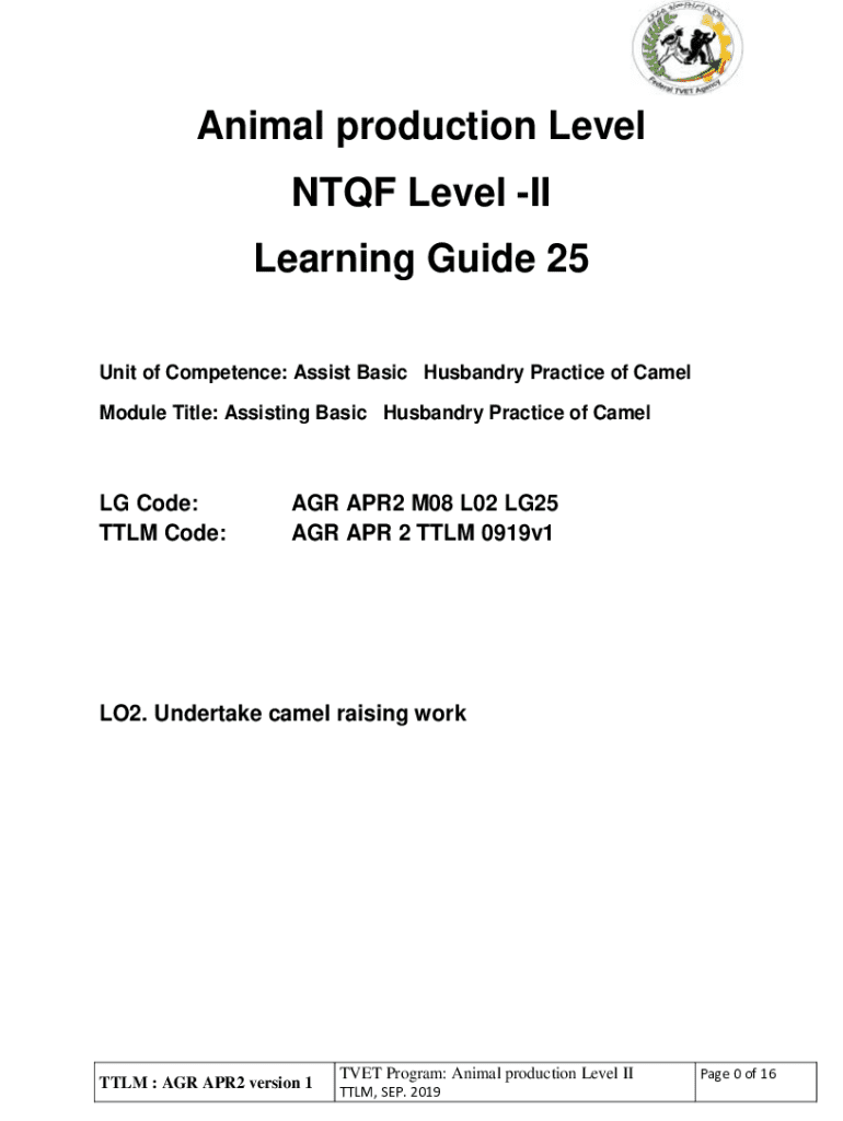 Animal production Level NTQF Level II Learning Guide 25 Unit of Competence: Assist Basic Husbandry Practice of Camel Module Title: Assisting Basic Husbandry Practice of CamelLG Code: TTLM Code:AGR