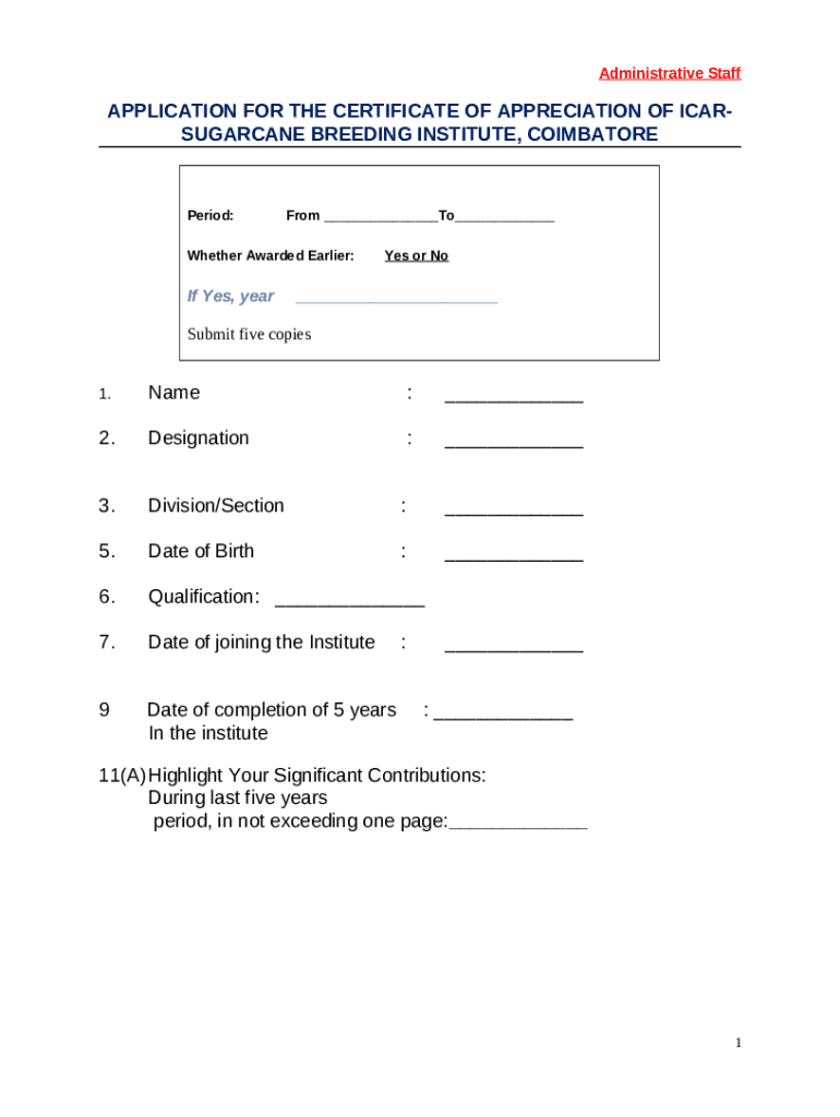Instructions for the form APPLICATION FOR THE CERTIFICATE OF APPRECIATION OF ICAR-SUGARCANE BREEDING INSTITUTE, COIMBATORE